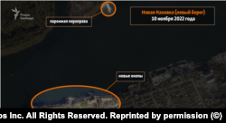В самой Новой Каховке окопы вырыты российскими войсками в районе причала, который российская армия использовала для переброски войск с берега на берег. Ранее Радио Свобода и "Схемы" писали о работавшей там паромной переправе: с помощью спутниковых снимков нам удалось установить, что Россия начала вывозить солдат и военную технику с правого берега еще в середине октября.
